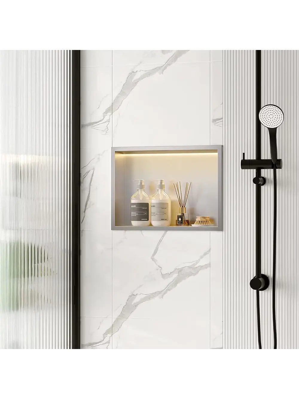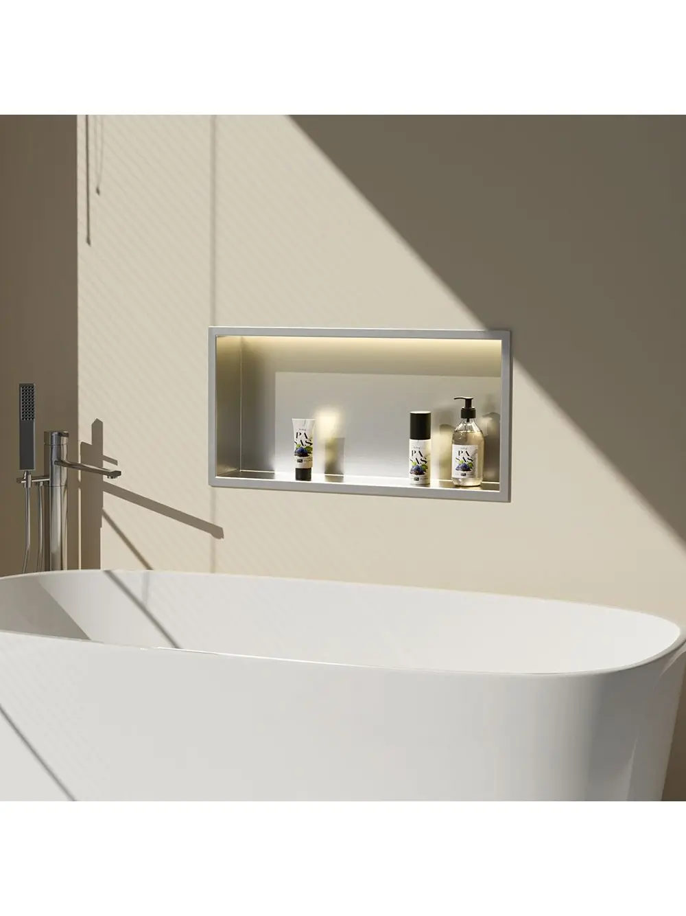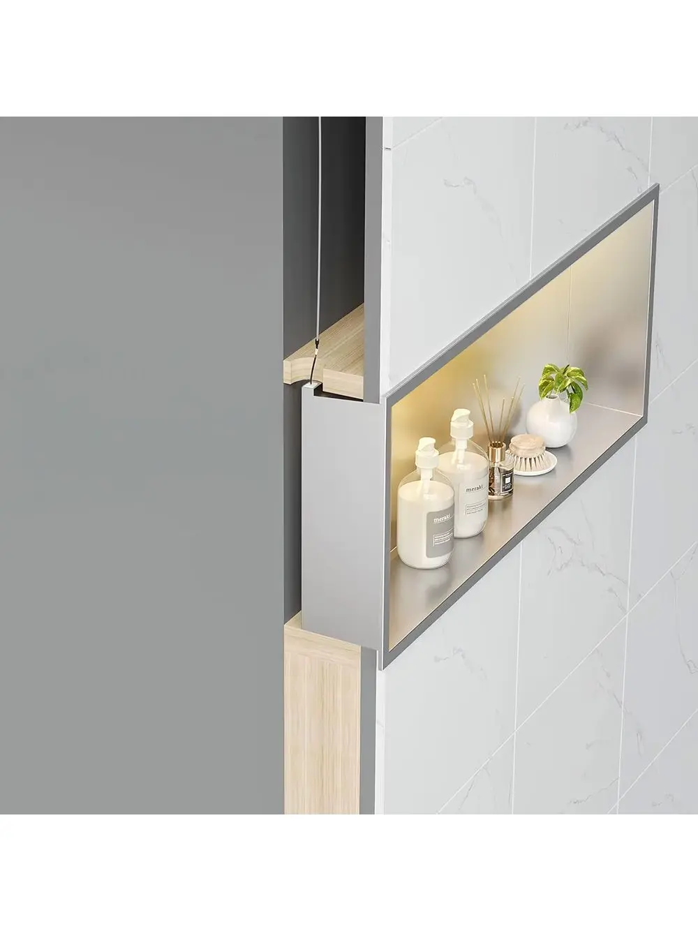 Polița încastrată pentru baie cu iluminare LED integrată, de 12 W emite o lumină caldă și plăcută, care adaugă un caracter atmosferic interiorului și crește confortul zilnic. Montajul încastrat permite obținerea unui efect minimalist și modern, iar polița oferă un spațiu convenabil pentru depozitarea cosmeticelor și accesoriilor de baie. Este o soluție ideală pentru duș, deasupra căzii sau într-o altă zonă a băii.