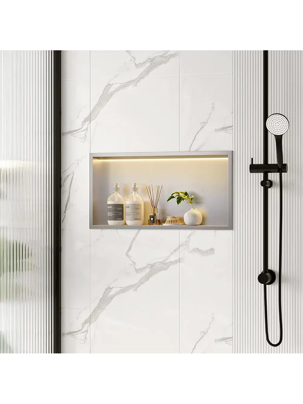 Polița încastrată pentru baie cu iluminare LED integrată, de 12 W emite o lumină caldă și plăcută, care adaugă un caracter atmosferic interiorului și crește confortul zilnic. Montajul încastrat permite obținerea unui efect minimalist și modern, iar polița oferă un spațiu convenabil pentru depozitarea cosmeticelor și accesoriilor de baie. Este o soluție ideală pentru duș, deasupra căzii sau într-o altă zonă a băii.