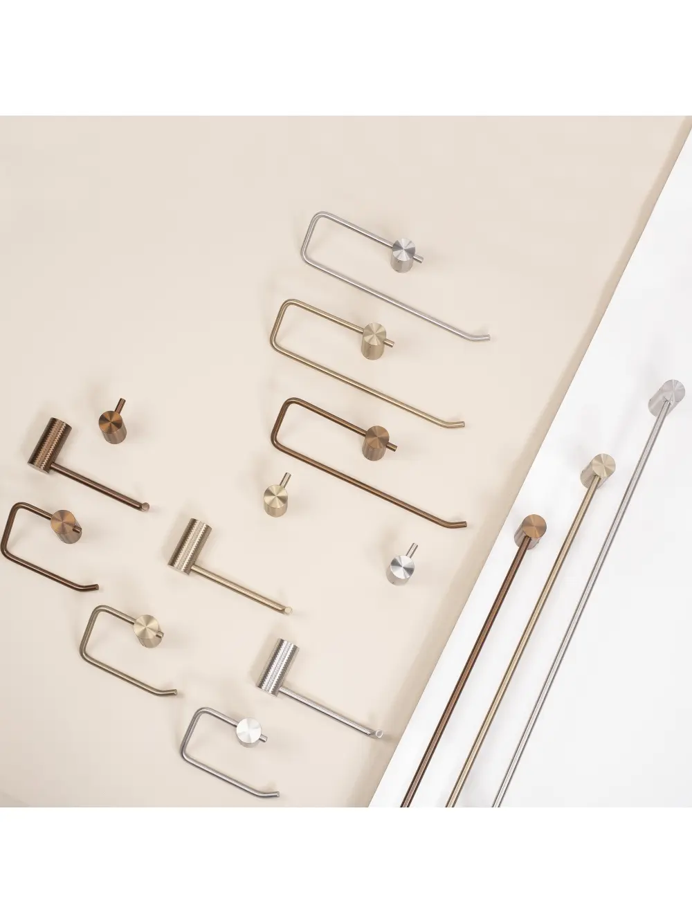Estetică coerentă: finisajul cupru periat se potrivește în ansamblu cu baterii, oglinzi și alte accesorii moderne.