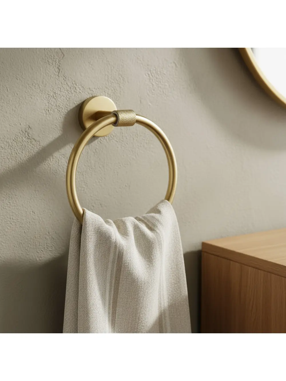 Acest suport de prosop este ideal pentru băi cu design contemporan, minimal sau industrial-chic: profilurile simple, finisajul auriu periat și montajul pe perete îl fac ușor de integrat.