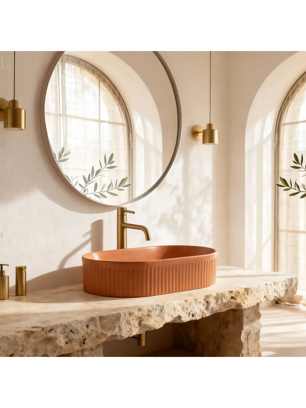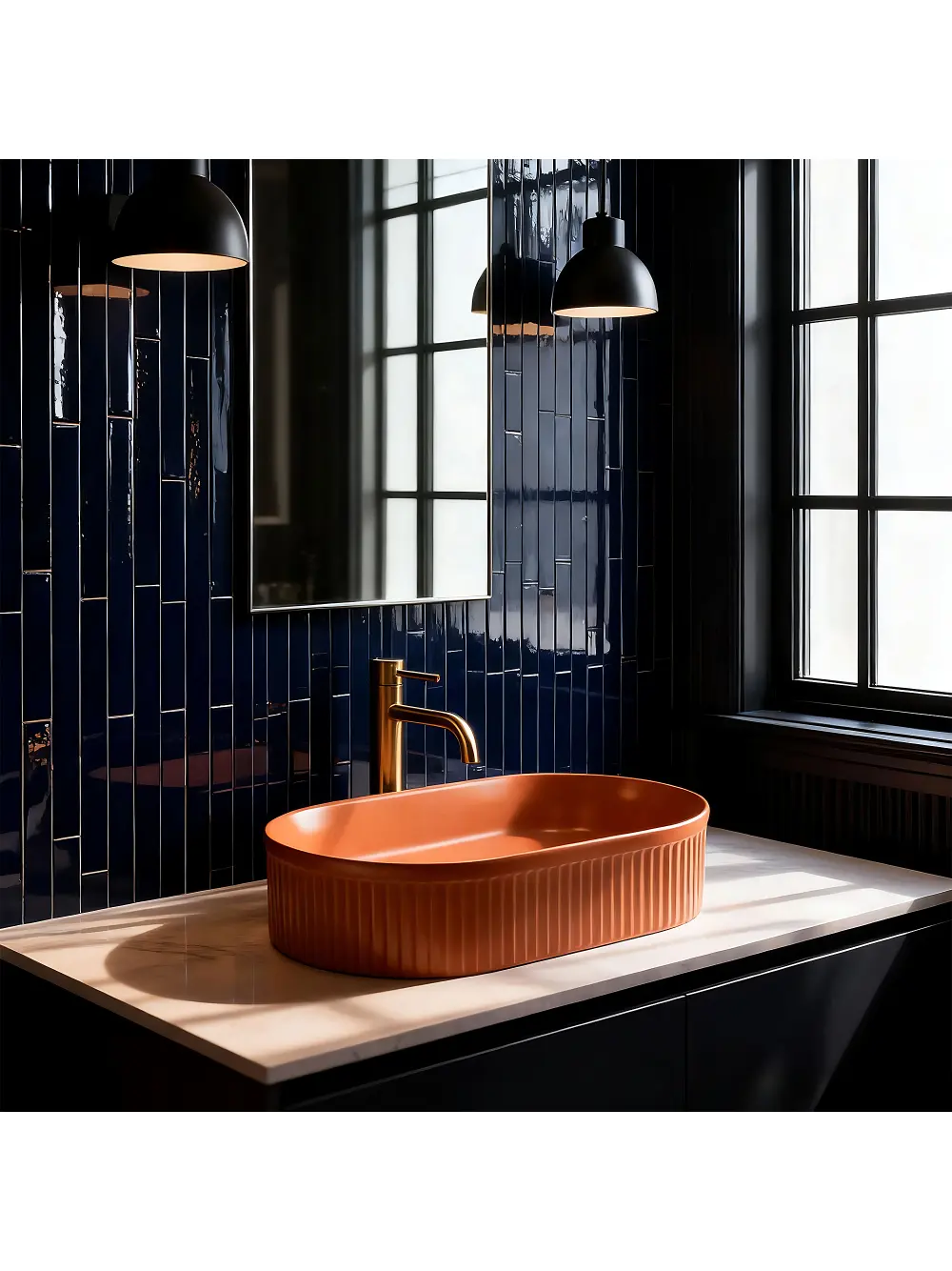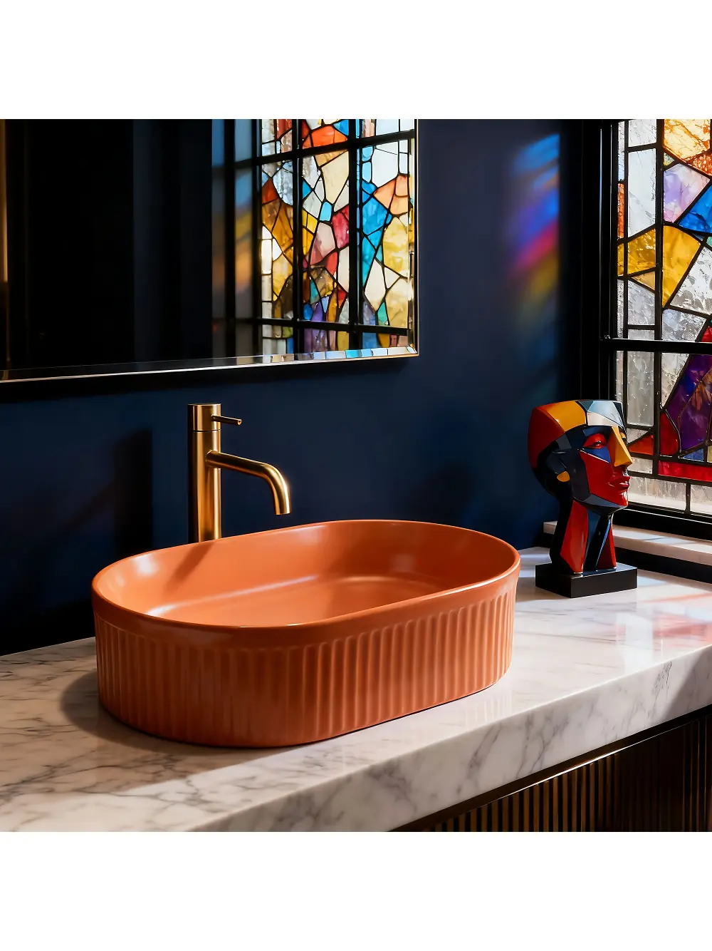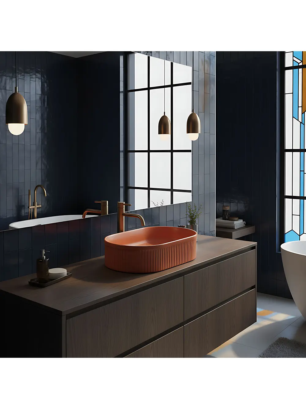 portocaliu mat – Cinnamon, acest lavoar adaugă o notă caldă și elegantă oricărui decor. Poate fi combinat cu accesorii aurii, negre, cromate sau din cupru, în funcție de stilul dorit. Într-un decor minimalist, devine piesa centrală care atrage toate privirile, iar într-un ambient eclectic, completează perfect mixul de texturi și culori.